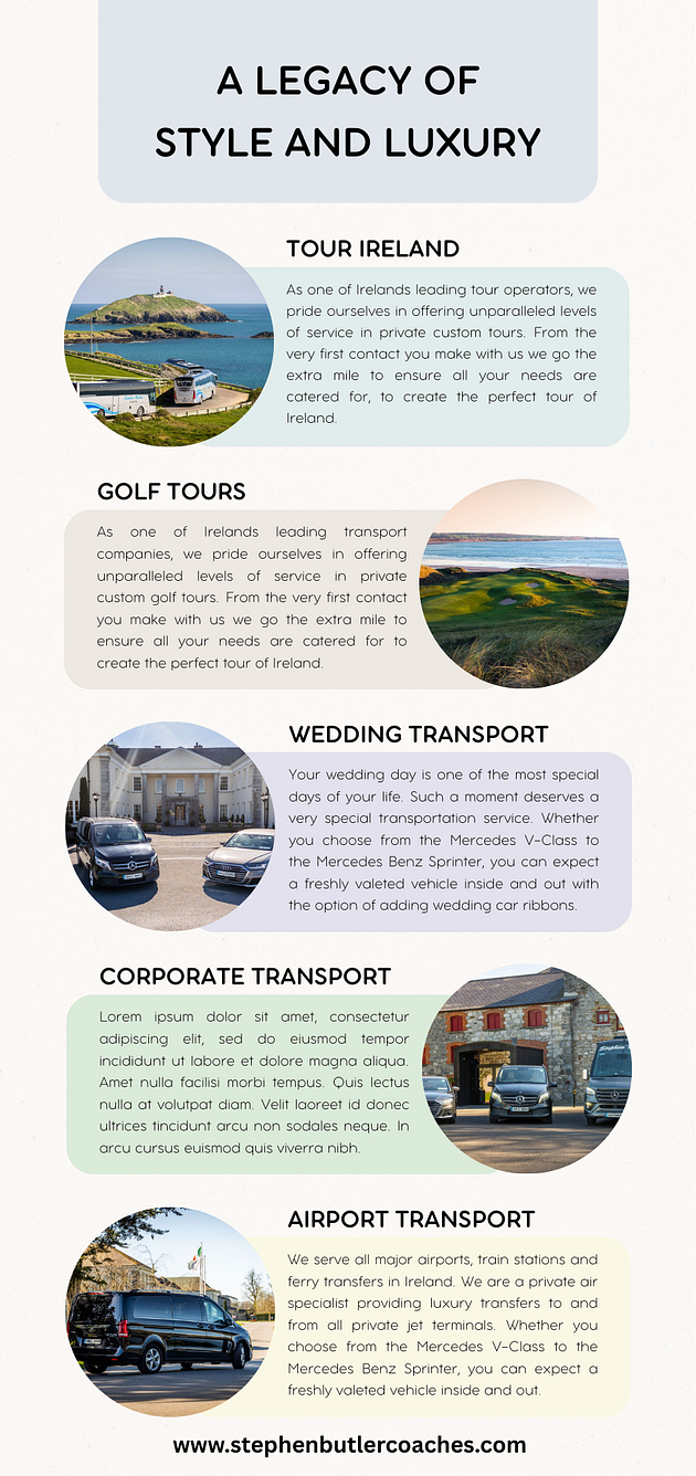 Stephen Butler Coaches is a family-owned business providing luxury executive travel in Cork and throughout Ireland with over 40 years of experience. We specialise in luxury private cars, minivans and coaches. Our professional drivers strive to ensure all our client’s needs and expectations are exceeded as well as offer unparalleled levels of service.